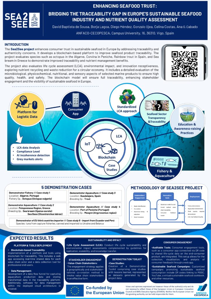 SEA2SEE partner ANFACO presented the project’s methodology for establishing a traceability methodology to address current gaps in seafood and aquaculture feed at the International Conference on Renewable Resources & Biorefineries held in Brussels, 5 – 7 June 2024. The conference focuses on the industrial bioeconomy, green chemistry and agricultural policies related to the use of renewable raw materials, especially for non-food and energy applications. It included sessions on biorefineries, bio-based materials, circular economy, marine applications, and food waste valorization. It brought together approximately 300 participants, including academia, industry, government agencies.